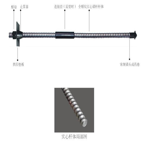 中空注浆锚杆的锚杆体采用中空设计,杆体中孔作为钻进高压风水通道和注浆通道,与实心杆体相比,中空杆体设计可获得更好的刚度和抗剪强度。锚杆体外表面全长标准大螺距螺纹结构,螺纹结构便于锚杆的切割和接长,与光滑杆体相比增加了锚杆体与注浆材料的粘接面积从而提高了锚固力。