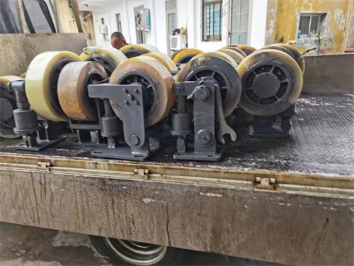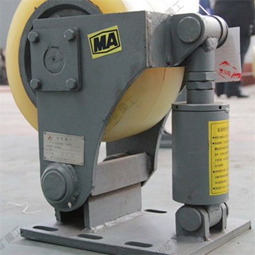L系列滚轮罐耳用于矿山提升容器的导向缓冲,本产品采用先进的密封技术,适应淋水、煤尘等恶劣环境。轮头安装采用三锁紧结构,彻底避免掉轮头事故的发生。滚轮采用四氢呋喃-环氧丙烷共聚醚型聚氨酯浇注,具有高弹性、耐撕裂、抗水性、抗油性的优点。滚轮磨损补偿调节采用左、右旋螺杆,调节迅速便捷。机座、摆架采用优质钢板焊接成型,体积小、重量轻,安装轻便。滚轮罐耳主要由轮轴、支架、缓冲装置、底座等组成。