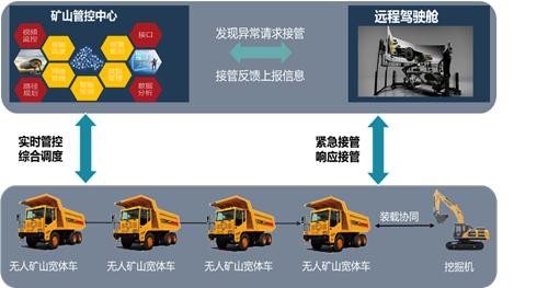 在大唐集团宝利主要验证5G和无人驾驶的功能以及可靠性,参与作业生产的系统包括远程驾驶、自动驾驶、机群管控,三个系统在不同阶段参与车辆行驶作业和装卸作业生产。远程驾驶车端配备5G终端、高清摄像头、车载控制器,当作业生产需要远程驾驶系统时,主动向机群管控中心提出接管请求,机群管控中心通过5G网络实现远程控制。自动驾驶系统通过V2X、多种传感器信息融合计算和决策实现超视距融合感知,结合车辆自身的定位和地图信息进行决策规划,进行自主作业。机群管控中心将路侧感知的信息融合分析构建虚拟环境模型,预测系统运行状况;另外实现露天矿山挖掘机设备、运输设备的协同生产场景进行实时监控、调度作业和生产指挥。