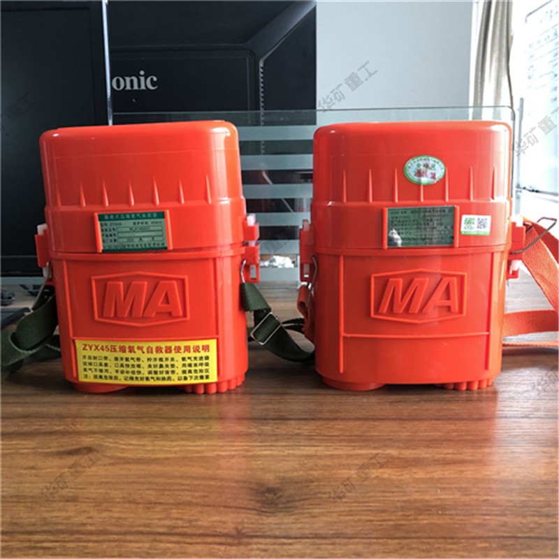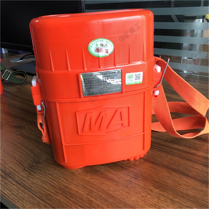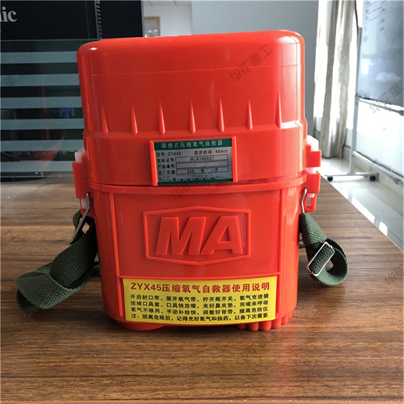压缩氧自救器又叫隔绝式压缩氧自救器,是以高压压缩氧气作为氧气源的可重复使用的自救逃生器材,主要在煤矿或普通大气压的作业环境中发生有毒有害气体突出及缺氧窒息性灾害时使用。人体呼吸系统内部与外界隔绝,供遇险人员快速自救逃生时使用。具有重量轻、体积小、呼吸舒适和携带方便等特点。根据防护时间有15、30、45min几种规格。