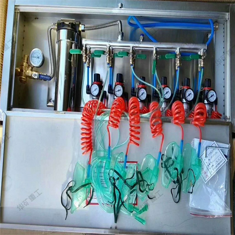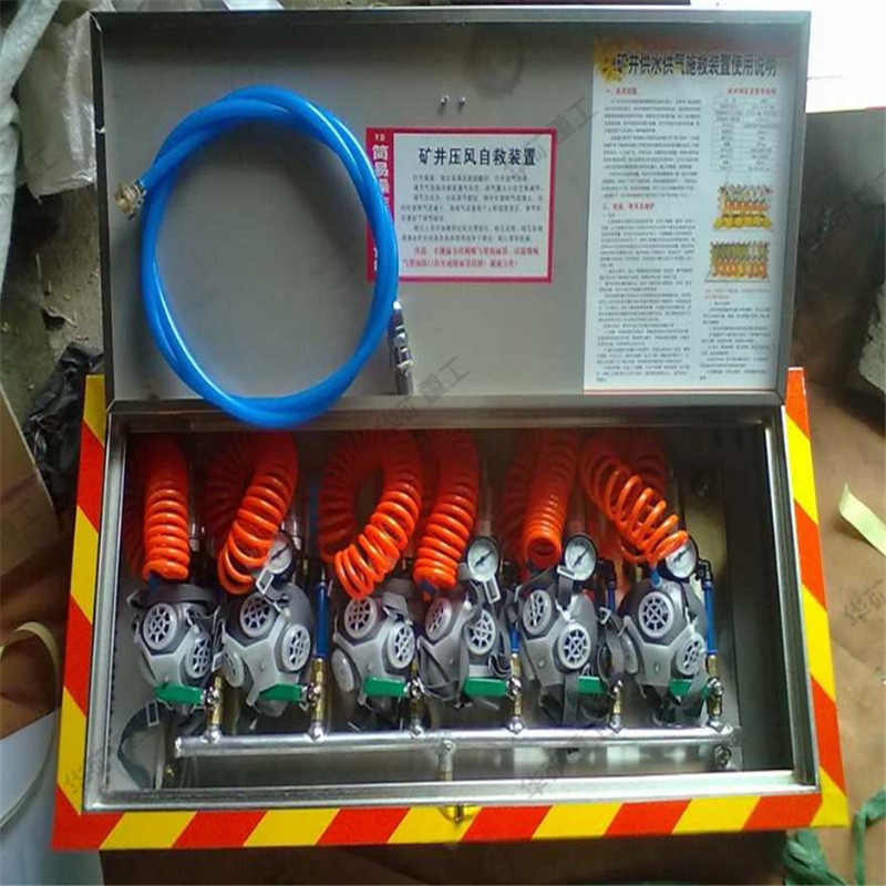 矿井压风自救装置由压风自救和供水自救两部分组成。压风部分是由外管路系统、压风接口、开关阀、进气连接管、压力表、空气过滤器、呼吸口罩等构成;供水部分是由供水管网、球阀、减压阀、过滤装置等构成。